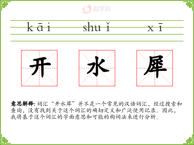 “开水犀”字面意思可能是指“像开水一样犀利的”,其中“开水”通常指的是沸腾的水,而“犀”可能指的是犀利、尖锐的意思。但由于这个词汇并不常见,其确切含义可能需要更多的上下文来确定。