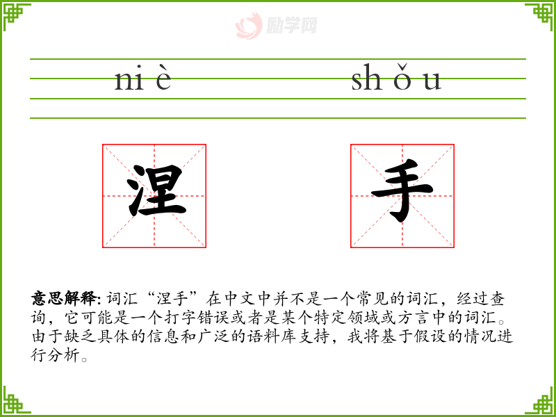词汇“涅手”在中文中并不是一个常见的词汇,经过查询,它可能是一个打字错误或者是某个特定领域或方言中的词汇。由于缺乏具体的信息和广泛的语料库支持,我将基于假设的情况进行分析。