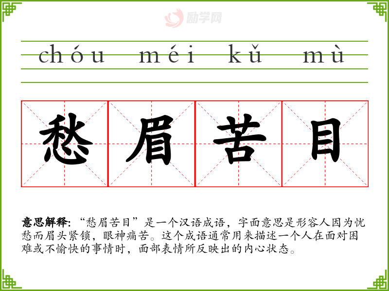 “愁眉苦目”是一个汉语成语,字面意思是形容人因为忧愁而眉头紧锁,眼神痛苦。这个成语通常用来描述一个人在面对困难或不愉快的事情时,面部表情所反映出的内心状态。