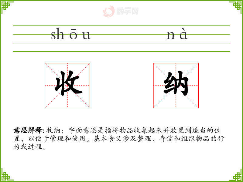 收纳:字面意思是指将物品收集起来并放置到适当的位置,以便于管理和使用。基本含义涉及整理、存储和组织物品的行为或过程。