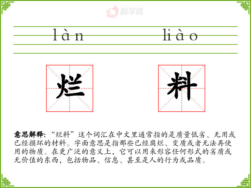 - 口语:在日常对话中,人们可能用“烂料”来批评某样东西的质量差,或者形容某人的行为不端。