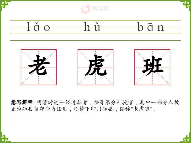 老虎班的意思是:明清时进士经过朝考﹐按等第分别授官﹐其中一部分人被点为知县当即分省任用﹐称榜下即用知县﹐俗称"老虎班"。