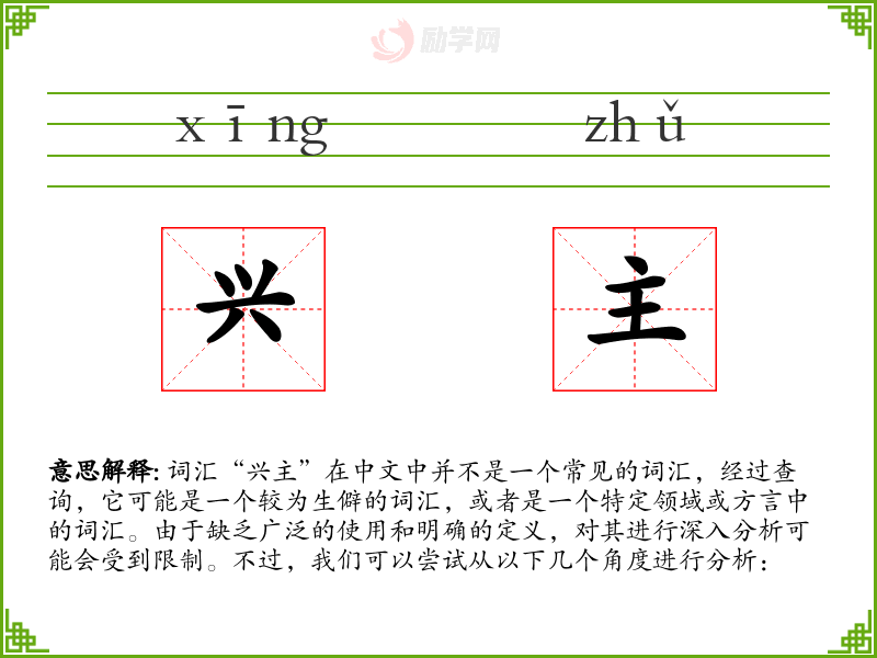 由于“兴主”不是一个常见词汇,对其的理解可能非常有限。在语言学习和表达中,可能需要具体的语境来解释其含义。