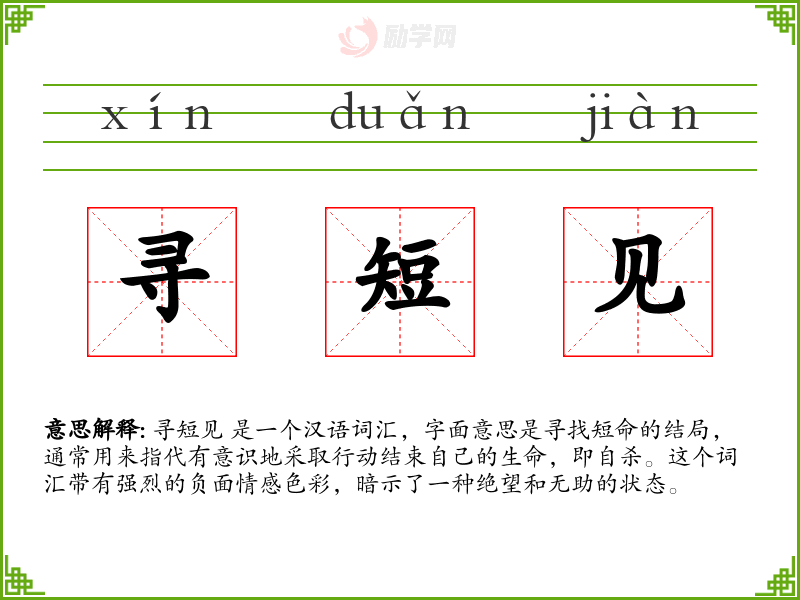 寻短见 是一个汉语词汇,字面意思是寻找短命的结局,通常用来指代有意识地采取行动结束自己的生命,即自杀。这个词汇带有强烈的负面情感色彩,暗示了一种绝望和无助的状态。