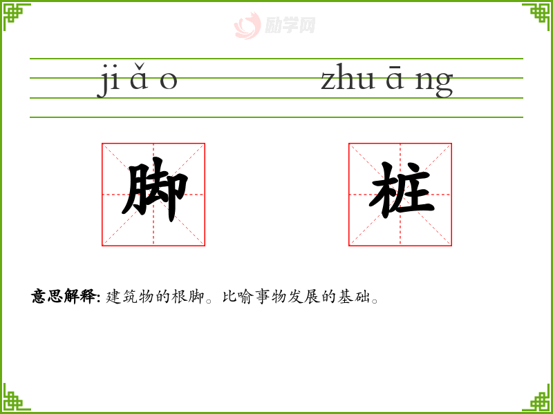 脚桩的意思是:建筑物的根脚。比喻事物发展的基础。