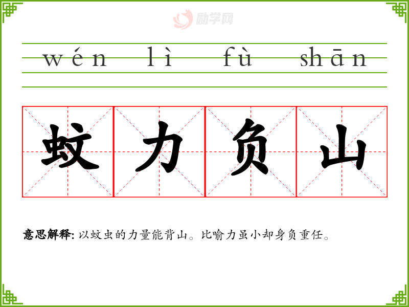 以蚊虫的力量能背山。比喻力虽小却身负重任。