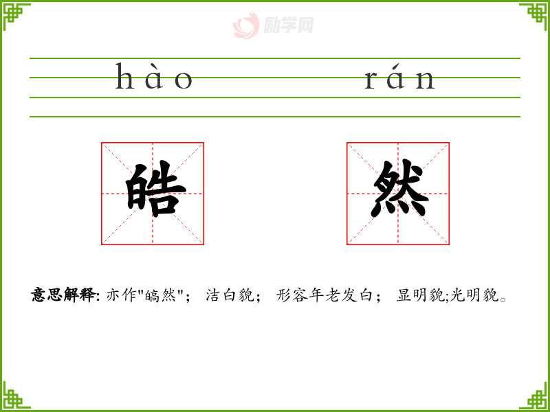 皓然的意思是:亦作"皜然"; 洁白貌; 形容年老发白; 显明貌;光明貌。