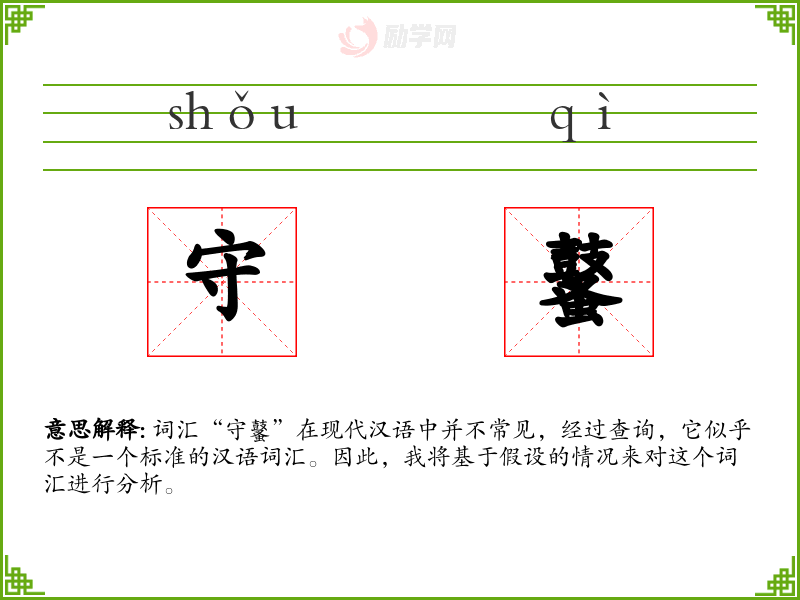 词汇“守鼜”在现代汉语中并不常见,经过查询,它似乎不是一个标准的汉语词汇。因此,我将基于假设的情况来对这个词汇进行分析。
