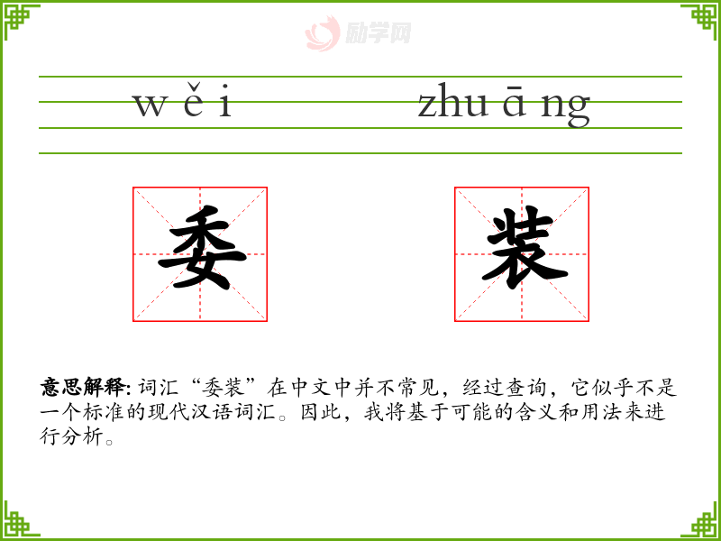 词汇“委装”在中文中并不常见,经过查询,它似乎不是一个标准的现代汉语词汇。因此,我将基于可能的含义和用法来进行分析。