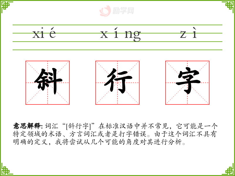 由于“[斜行字]”不是一个标准的汉语词汇,我们无法给出确切的基本定义。它可能是指某种书写方式,比如斜体字,或者是某种特定的排版风格。