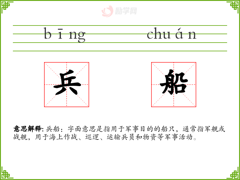 兵船:字面意思是指用于军事目的的船只,通常指军舰或战舰,用于海上作战、巡逻、运输兵员和物资等军事活动。