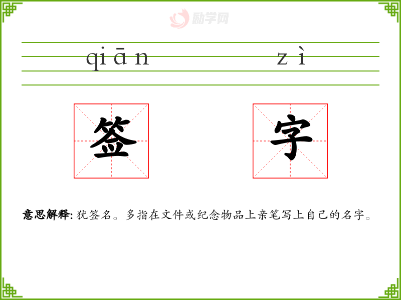 签字的意思是:犹签名。多指在文件或纪念物品上亲笔写上自己的名字。