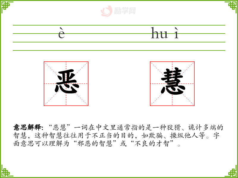 “恶慧”一词在中文里通常指的是一种狡猾、诡计多端的智慧,这种智慧往往用于不正当的目的,如欺骗、操纵他人等。字面意思可以理解为“邪恶的智慧”或“不良的才智”。