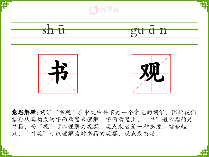 同义词:阅读观、读书态度、书评观点 反义词:(由于“书观”不是一个常用词汇,反义词可能不太明确,但如果要找一个相对的概念,可能是“书盲”或“阅读厌恶”)