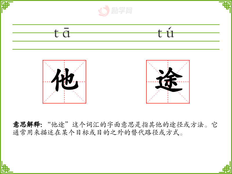 “他途”由“他”和“途”两个字组成。在古代汉语中,“他”指代“其他的”,“途”指代“路径”或“方法”。随着时间的推移,这个词汇的含义基本保持不变,但在现代汉语中使用频率可能有所下降。