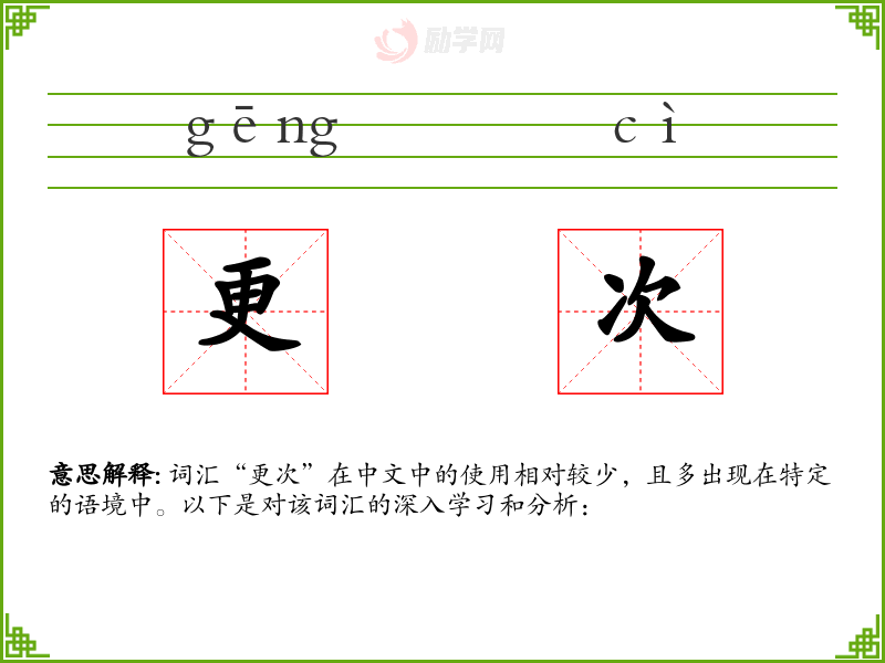 词汇“更次”在中文中的使用相对较少,且多出现在特定的语境中。以下是对该词汇的深入学*和分析: