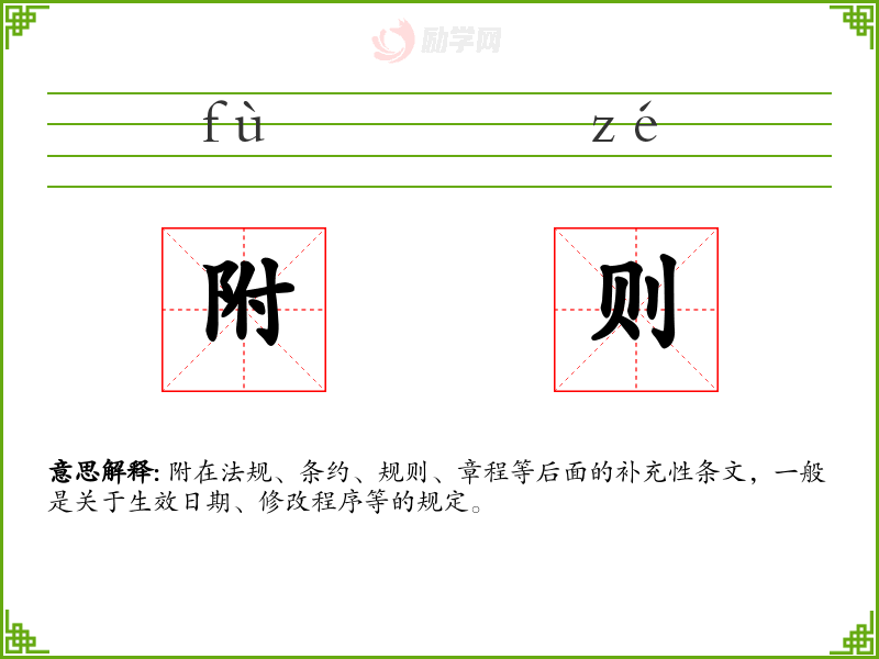 附则的意思是:附在法规、条约、规则、章程等后面的补充性条文,一般是关于生效日期、修改程序等的规定。
