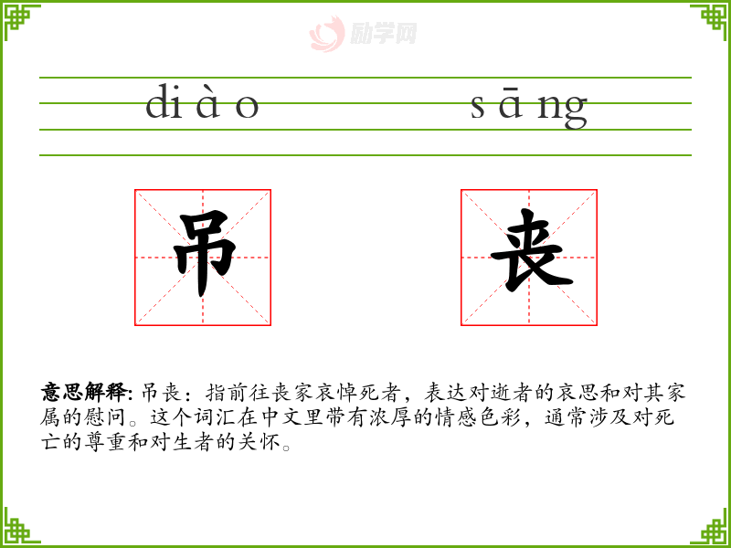 - 反义词:庆祝、欢聚(这些词汇与吊丧的悲伤氛围形成鲜明对比)