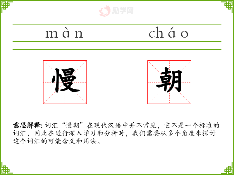 词汇“慢朝”在现代汉语中并不常见,它不是一个标准的词汇,因此在进行深入学习和分析时,我们需要从多个角度来探讨这个词汇的可能含义和用法。