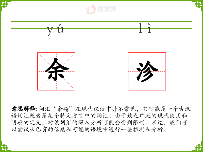 由于“余殗”不是一个常见的现代汉语词汇,我们无法给出一个确切的基本定义。它可能是由“余”和“殗”两个字组成的复合词。在古汉语中,“余”可以表示“剩余”、“多余”或“我”的意思,而“殗”则较少见,可能与“淹”有关,表示“淹没”或“沉没”。