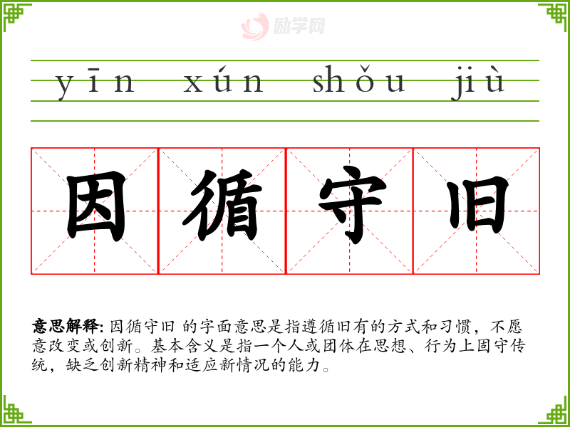 因循守旧 这个词提醒我,在学*和工作中,保持开放的心态,勇于接受新思想和新技术是非常重要的。它不仅影响个人的成长,也关系到组织和社会的发展。通过理解和应用这个词,我能够更好地识别和避免保守的态度,促进创新和进步。
