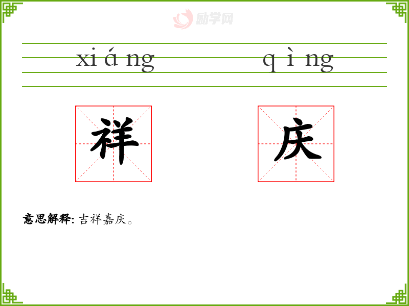 《说文》。段注:“谓心所喜而行也。”-庆,行贺人也。…吉礼以鹿皮为挚,故从鹿省。 《广雅·释言》-庆,贺也。 《公羊传·昭公二十五年》-庆子家驹。 《国语·鲁语》-故庆其喜。 《诗·小雅·裳者华》-是以有庆矣。 《三国志·吴主传》-蜀遣卫尉陈震庆权践位。 《史记·苏秦列传》-苏秦见齐王,再拜,俯而庆,仰而吊。