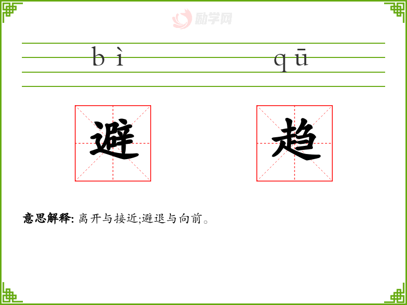 《说文》-避,回也。 《苍颉篇》-避,去也。 《国语·周语》-无乃实有所避。 晋·陶渊明《桃花源记》-自云先世避秦时乱。 清·周容《芋老人传》-有书生避雨檐下。