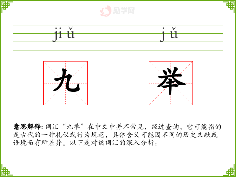 词汇“九举”在中文中并不常见,经过查询,它可能指的是古代的一种礼仪或行为规范,具体含义可能因不同的历史文献或语境而有所差异。以下是对该词汇的深入分析:
