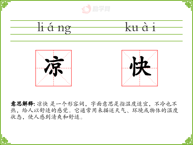 凉快 是一个形容词,字面意思是指温度适宜,不冷也不热,给人以舒适的感觉。它通常用来描述天气、环境或物体的温度状态,使人感到清爽和舒适。
