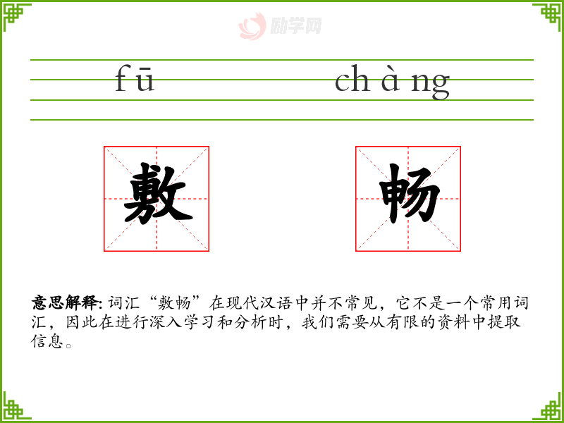 词汇“敷畅”在现代汉语中并不常见,它不是一个常用词汇,因此在进行深入学*和分析时,我们需要从有限的资料中提取信息。