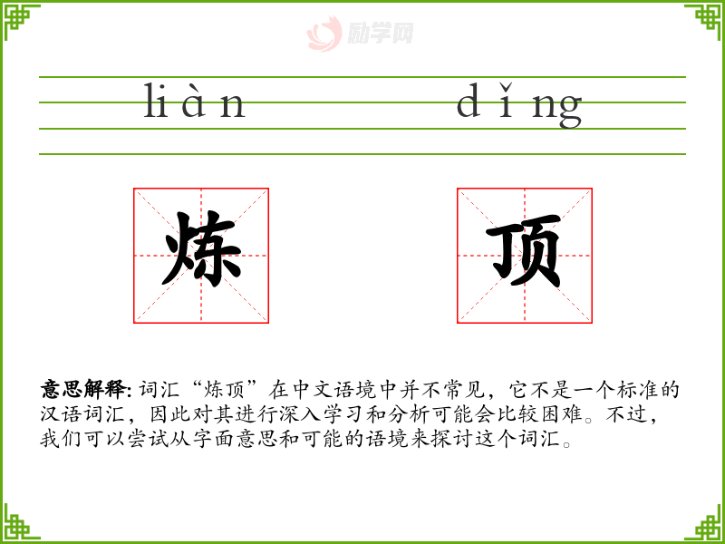 词汇“炼顶”在中文语境中并不常见,它不是一个标准的汉语词汇,因此对其进行深入学习和分析可能会比较困难。不过,我们可以尝试从字面意思和可能的语境来探讨这个词汇。