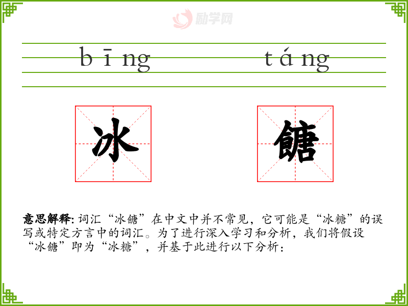 词汇“冰餹”在中文中并不常见,它可能是“冰糖”的误写或特定方言中的词汇。为了进行深入学*和分析,我们将假设“冰餹”即为“冰糖”,并基于此进行以下分析: