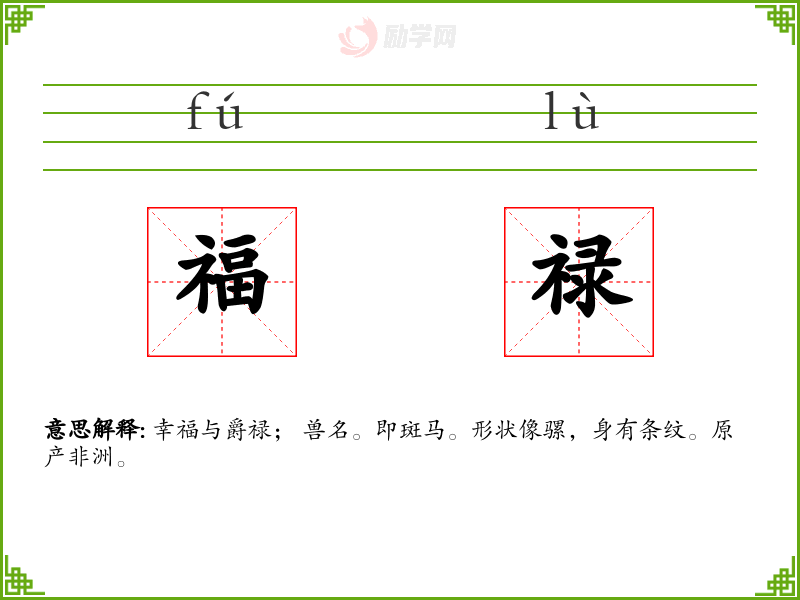 福禄的意思是:幸福与爵禄; 兽名。即斑马。形状像骡,身有条纹。原产非洲。