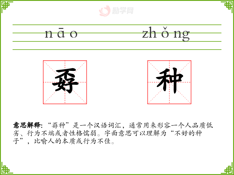 孬种的意思是:方言。坏种,坏家伙; 方言。怯懦无能的人。
