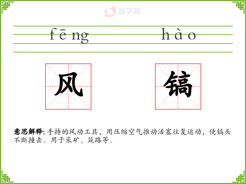 风镐的意思是:手持的风动工具,用压缩空气推动活塞往复运动,使镐头不断撞击。用于采矿、筑路等。