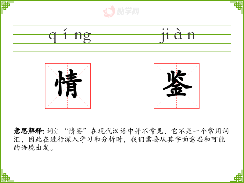 词汇“情鉴”在现代汉语中并不常见,它不是一个常用词汇,因此在进行深入学*和分析时,我们需要从其字面意思和可能的语境出发。