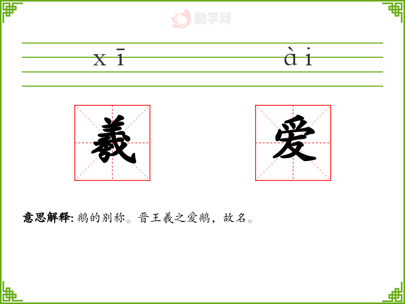 羲爱的意思是:鹅的别称。晋王羲之爱鹅,故名。