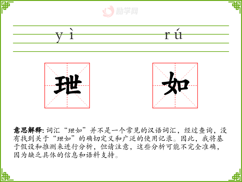 词汇“玴如”并不是一个常见的汉语词汇,经过查询,没有找到关于“玴如”的确切定义和广泛的使用记录。因此,我将基于假设和推测来进行分析,但请注意,这些分析可能不完全准确,因为缺乏具体的信息和语料支持。