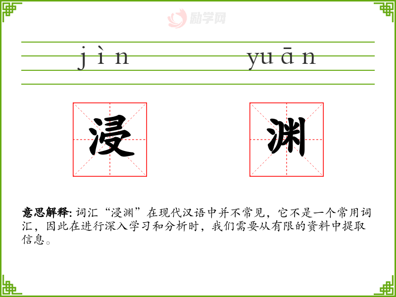 “浸渊”这个词的构成较为直观,由“浸”和“渊”两个字组成。在古代汉语中,“渊”常用来形容深水或深邃的地方,而“浸”则表示浸泡的动作。这个词可能在古代文学作品中有所使用,但在现代汉语中并不常见。