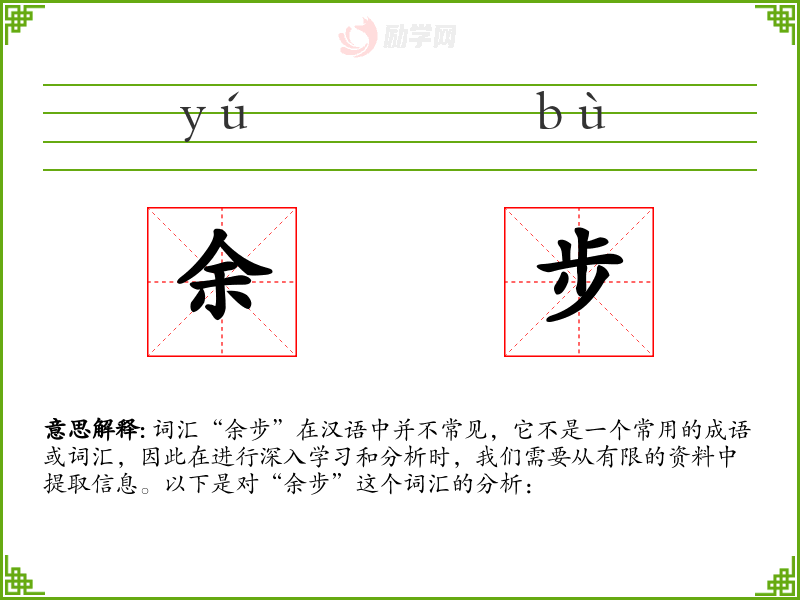 词汇“余步”在汉语中并不常见,它不是一个常用的成语或词汇,因此在进行深入学习和分析时,我们需要从有限的资料中提取信息。以下是对“余步”这个词汇的分析: