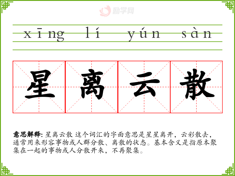 星离云散 这个词汇不仅描述了物理上的分散,也触及了情感和文化的深层含义。在学*语言和表达时,理解和运用这样的词汇可以丰富我们的语言表达,增加文本的深度和情感色彩。