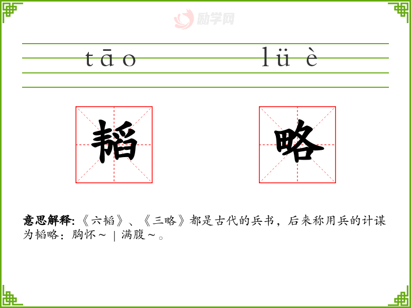 韬略的意思是:《六韬》、《三略》都是古代的兵书,后来称用兵的计谋为韬略:胸怀~|满腹~。