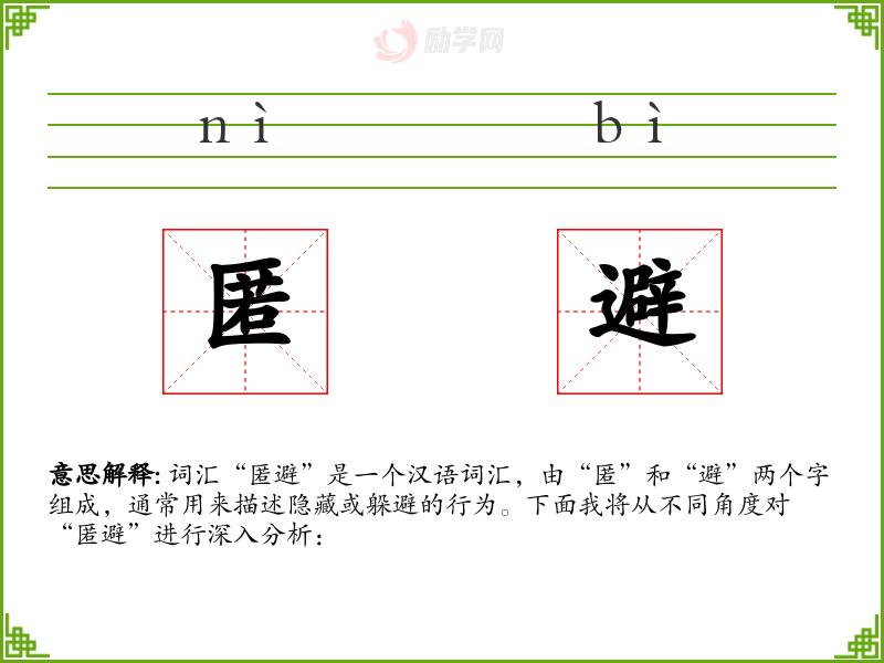 - 视觉:想象一个人躲在阴影中,避开光线,这种画面可以与“匿避”联系起来。