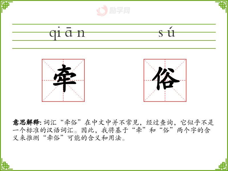 “牵”字通常有牵引、牵连、牵制的意思,而“俗”字则指普通、世俗、通俗的事物。结合起来,“牵俗”可能指的是被世俗所牵制或影响,即受到普通社会习俗或观念的束缚。