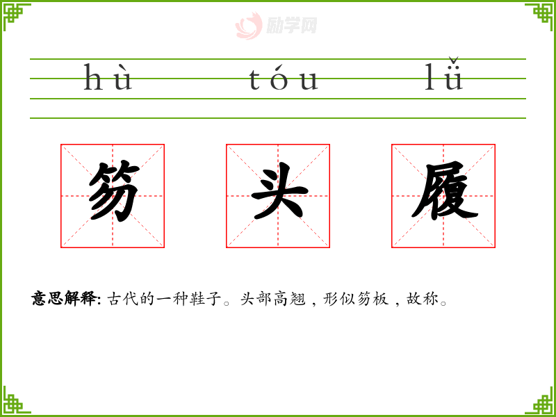 笏头履的意思是:古代的一种鞋子。头部高翘﹐形似笏板﹐故称。