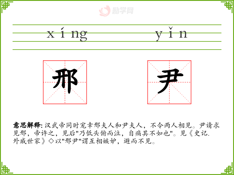 汉武帝同时宠幸邢夫人和尹夫人,不令两人相见。尹请求见邢,帝许之,见后"乃低头俯而泣,自痛其不如也"。见《史记.外戚世家》◇以"邢尹"谓互相嫉妒,避而不见。