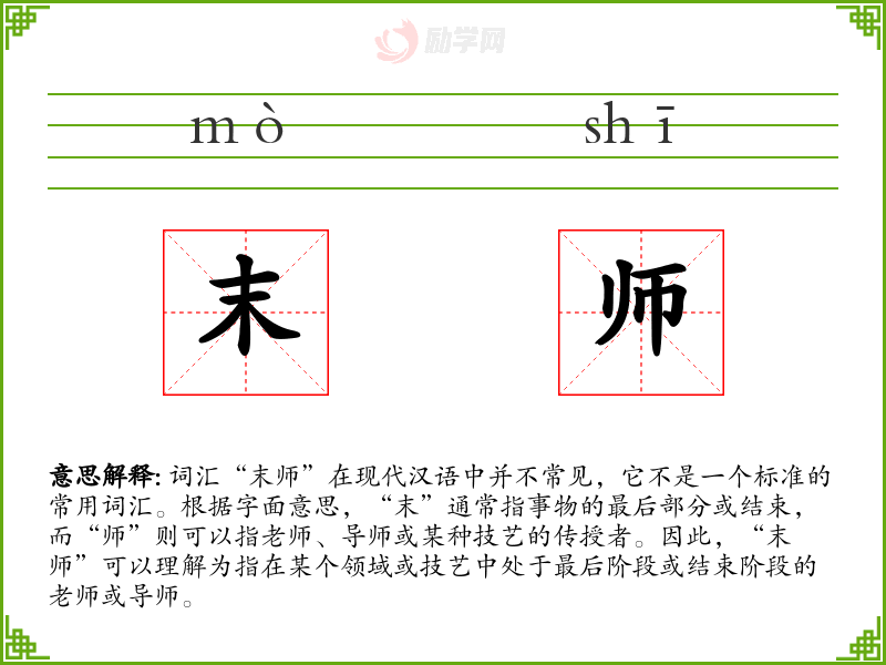 词汇“末师”在现代汉语中并不常见,它不是一个标准的常用词汇。根据字面意思,“末”通常指事物的最后部分或结束,而“师”则可以指老师、导师或某种技艺的传授者。因此,“末师”可以理解为指在某个领域或技艺中处于最后阶段或结束阶段的老师或导师。