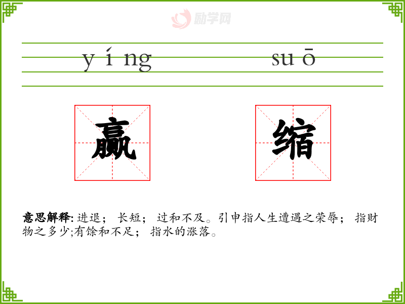 赢缩的意思是:进退; 长短; 过和不及。引申指人生遭遇之荣辱; 指财物之多少;有馀和不足; 指水的涨落。
