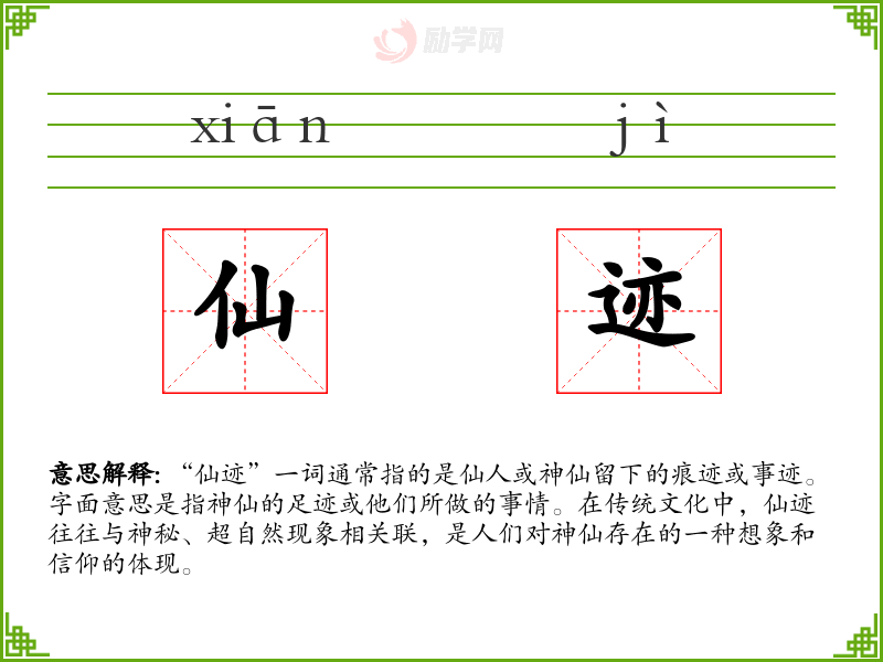 “仙迹”一词在*传统文化中占有重要地位,它不仅是对神仙信仰的一种体现,也是人们对神秘和超自然现象的一种解释方式。在学语言和表达中,理解和运用“仙迹”这一词汇,有助于更好地把握和传承**传统文化的精神内涵。