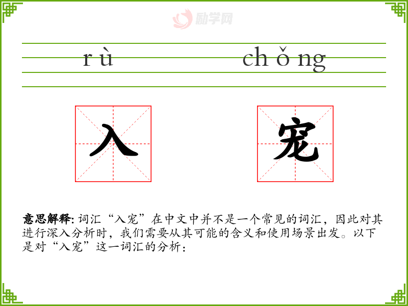 词汇“入宠”在中文中并不是一个常见的词汇,因此对其进行深入分析时,我们需要从其可能的含义和使用场景出发。以下是对“入宠”这一词汇的分析: